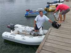Auch wir werden sogleich aktiv, bestellen beim Segelmacher ein Cover (Schutzüberzug) für unser neues Dinghi, damit die Schläuche nicht an jedem Steg angekratzt werden. Und tatsächlich schafft es Simon innerhalb von 1 Woche ein perfekt sitzendes wunderschönes blaues Cover zu nähen und das zu einem wirklich günstigen Preis von 160 US$. Für den neuen 15 PS Yamaha Außenborder, den wir bei Marina Juan bestellt haben, näht er auch noch gleich eine Schutzhülle und Hebegurte, damit wir das 40 kg schwere Monsterteil von Motor auch an Bord heben können. Am Donnerstag ist es dann soweit, der Motor kann bei Juan abgeholt werden und Helmut’s Dinghi-Glück steht nichts mehr im Weg. Wie ein geölter Blitz jagt er durch die Anchorage, auch mit 3 Personen kommt es noch in Gleitfahrt. Da ist es gar kein Problem mehr, eben mal zur Wäscherei auf die andere Seite der Bucht zu fahren oder schnell noch die Tauchflaschen füllen zu lassen. Doch das wichtigste kommt erst noch, das Bierbunkern. Da es in den Supermärkten bei Sigo und Rattan kein Polarbier zu kaufen gibt, hat die Crew der SY September die Initiative ergriffen und direkt bei der Brauerei eine Sammelbestellung für 7 Schiffe aufgegeben. Am Samstag trifft dann ein ganzer LKW mit Polardosenbier in 24er Paletten ein. Mit dem neuen großen Dinghi ist der Transport zum Schiff kein Problem, doch das Verstauen an Bord ist dann echt schweißtreibend, denn wir wollen die Plastik- und Wellpappeverpackung natürlich wegen der Kakerlakengefahr nicht mit an Bord nehmen.