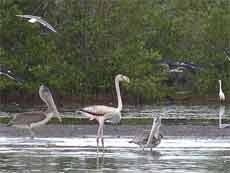 Da der Ankerplatz aber doch recht unruhig ist ziehen wir nach einigen Tagen zusammen mit der Carpe Diem und der Moby Dick noch weiter bis ans Ende des Golfos de Cariaco vor den ehemals wichtigen Hafenort Muelle (Kai) de Cariaco, der heute ziemlich trostlos sein Dasein fristet. Die Kinder und Jugendlichen aus dem Ort rudern zu uns heraus an den Ankerplatz begrüßen uns und fragen auch gleich nach Süßigkeiten, Getränken und Zigaretten. Sie fragen uns ein wenig aus, ob wir zusammengehören, wie viel Leute wir sind usw. So ganz geheuer ist uns das nicht und auch der Ausflug an Land ist nicht gerade berauschend, es gibt keinen vernünftige anlegemöglichkeit und wir haben so unsere Bedenken, wegen unseres Dinghis. Unseren Plan, von hier aus mit dem Bus zu der Höhle von Caripe zu fahren, geben wir dann auf, weil wir das Schiff nicht einen ganzen Tag allein lassen wollen. Statt dessen unternehmen wir mit dem Dinghi eine Ausfahrt in die Mangroven zum "Bird watching" (Vögelbeobachten). Tatsächlich sehen wir die roten Scarlet Ibise, den Nationalvogel von Trinidad, in ganzen Schwärmen herumfliegen. Nach einigem Ausharren können wir sie sogar aus nächster Nähe fotografieren, doch sie halten immer einen respektablen Sicherheitsabstand zu uns, sodass wir nicht das wirklich tolle Knallerfoto schießen können. Der Golfo de Cariaco ist wie so viele Regionen in Venezuela sehr dünn besiedelt, überall gibt es unberührte Natur zu entdecken.