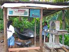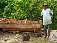In der Prince Rupert Bay/Dominica treffen wir Jan, den neuen Trans-Ocean Stützpunktleiter, wieder. Wir haben ihn bereits in Porlamar im Oktober kennen gelernt und er hat uns viel über seine Pläne zum Aufbau der Bucht als Seglertreff erzählt. Es gibt bereits einen Dingisteg vor Big Papas Restaurant, in der Nacht patrouilliert ein Boot und hält Wache, morgens wird auf Bestellung frisches Brot an Bord geliefert, man kann Wasser bunkern und es gibt Internet an Land. Die Boatboys sprechen sich ab, wer für welches Boot zuständig ist und in Planung ist ein Tankboot, das auf Bestellung steuerfreien Treibstoff an die Yachten im Transit liefert. Hört sich alles gut an, der Anfang ist bereits gemacht und läuft auch schon. Man muss abwarten, wie sich das alles entwickelt. Gemeinsam mit Karl und Karin unternehmen wir unter der Führung von „Guide Cobra“ eine Inselrundfahrt durch den tropischen Regenwald und das fruchtbare Tal des Layou River. Cobra zeigt uns Kakao- und Ananaspflanzen, gibt eine Lehrvorführung „wie öffnet man mit einem Stein eine Kokosnuss“, wir riechen an einem zerriebenen Blatt vom Zimtbaum und am Zitronengras, das hier überall am Wegrand wächst und lernen auch sonst noch einige uns unbekannte Pflanzen kennen. Trotz der immer wieder heftigen Regenfälle, der Regenwald macht seinem Namen alle Ehre, nehmen wir im Wasserfall ein Bad. Im Restaurant „Islet Views“ oberhalb von Castle Bruce an der Ostküste lassen wir uns ein typisch kreolisches Essen mit geräucherten Schweinerippchen in würziger Soße, Reis mit braunen Bohnen, gekochtem Maniok, gebratenen Plantains (Kochbananen) und einen Früchtenachtisch mit Kokosnusskrokant schmecken. Im Preis von 140,00 XCD (ca. € 42) für 4 Personen ist auch die herrliche Aussicht auf das Meer mit inbegriffen. Entlang der Ostküste fahren wir weiter durch das Carib Territory, ein 1800 ha großes Gebiet. Das Land wurde den letzen Nachkommen der auf den anderen Inseln ausgerotteten Karibenindianern 1903 von der englischen Königin Victoria übereignet und ist unverkäuflich. Die Kariben verlassen ihr Gebiet nur selten und leben sehr traditionsbewusst. Frauen, die heute einen Schwarzen heiraten wollen, müssen das Gebiet verlassen. Ihren Lebensunterhalt erwirtschaften die Cariben mit dem gemeinsamen Anbau von Bananen und Kokospalmen. Wie überall auf der Insel werden die Bananen in so genannten “Boxing Stations“, das sind offene Hütten, gesammelt und verpackt. Die Kokosnüsse werden vor den Hütten gesammelt, aus der dicken Faserschicht herausgeschält, halbiert und anschließend in Öfen langsam getrocknet, bis sich das Fruchtfleisch herauslöst. Diese Copra wird an die auf der Insel ansässige Öl- und Seifenfabrik verkauft. Der Fasermantel und die Hartschalen der Kokosnüsse werden zum Heizen der Öfen verwendet, ein perfektes Recycling. Die Frauen haben durch den Verkauf von Ketten aus Samen und Bambus und durch Flechtarbeiten, die mit verschiedenen Erdfarben eingefärbt sind, einen kleinen Nebenverdienst. Auch ich muss ihnen natürlich was abkaufen, obwohl ich schon 100 Körbchen und Ketten habe, allein schon als kleines Dankeschön für die Bilder, die wir machen durften. Die schweren Kanus bauen die Indianer für den Fischfang, jedoch auch für die Inselführer, die in der Prince Rupert Bay die Yachties versorgen und die Indian River Tour anbieten. Cobra, unser Inselführer, bestellt beim Bootsbauer das halbfertige Kanu. Das Besondere an den Kanus ist der untere Teil des Rumpfes, der aus einem einzigen Stamm gefertigt ist. Ein paar Kilometer weiter wird in einer riesigen Eisenpfanne über dem offenen Feuer das Mehl der Kasavawurzel getrocknet, um daraus Brot zu backen.