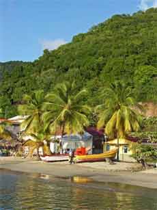 Mit dem Mietwagen unternehmen wir eine Inselrundfahrt, besichtigen die Domaine de la Pagerie, den Geburtsort von Josefine, Gemahlin Napoleons I. und Kaiserin von Frankreich. Von der ehemaligen Zuckerplantage sind noch Ruinen, zum Teil restauriert, erhalten. Die ganze Anlage dient als Museum und man kann eine interessante Sammlung von Gegenständen aus der präkolumbischen Zeit besichtigen. In Fort de France schauen wir uns in der Bibliotheque Schoelcher um. Dieses Gebäude fungierte 1989 auf der Weltausstellung in Paris als Pavillon der französischen Antillen und wurde anschließend nach Martinique verschifft und wiederaufgebaut. Bemerkenswert ist die ungewöhnliche Fassade aus Majolikafliesen, die noch vom Originalbau stammen. Nach einem Spaziergang entlang der neu gestalteten Uferpromenade geht die Fahrt weiter zur Ostküste nach Sainte-Marie und dem Rum-Museum Saint-James, am Abend bummeln wir durch Trois Islet und beschließen den Tag mit einem Essen in Point du Bout. Jeden Tag gehen heftige Regenschauer nieder, offensichtlich ist die Regenzeit immer noch nicht zu Ende. Doch die Beiden tragen es mit Fassung, an der Ostsee, ihrem Heimatrevier ist man schließlich ganz anderes gewöhnt. Es ist ja nicht wirklich kalt, nach jedem Schauer scheint gleich wieder die Sonne, da kommt man ganz schön ins schwitzen. Nächster Stopp ist St. Pierre und von dort geht es, auf Wunsch von Karl in einem Nachttörn bis in die Prince Rupert Bay im Norden von Dominica.