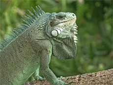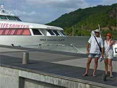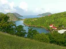 Die Iles des Saintes, Inseln der Heiligen, sind für uns die landschaftlich schönsten kleinen Inseln der Karibik. Sie liegen 11 km vor der Südküste von Guadeloupe (Basse Terre) und bestehen aus 2 größeren und mehreren kleineren Inseln. Wir gehen in der Anse á Cointe im Südwesten der Hauptinsel Terre de Haut vor Anker. Am Abend leuchtet über uns auf dem Hügel ein riesiges Kreuz und eine beleuchtete Jungfrau Maria. Das muss ja ein behüteter Ankerplatz sein. Im Windschatten des Pain de Sucre (Zuckerbrot) liegen wir geschützt vor der Welle im herrlich klaren Wasser, das zum Schnorcheln einlädt. An dem kleinen Sandstrand mit Palmen genießen wir und einige wenige Feriengäste die wunderbare Ruhe und bestaunen die Unterwasserwelt. Karin schnorchelt das erste Mal und ist bald ganz begeistert, was es unter Wasser alles zu sehen gibt. Beim nachmittäglichen Spaziergang haben wir eine herrliche Aussicht auf die benachbarten kleinen Inselchen und das Fort Napoleon, zu dem wir am nächsten Tag hinaufwandern, nachdem wir uns vor den Hauptort der Insel, Bourg des Saintes, verlegt haben. Das Fort hat wie schon im Juni am Nachmittag geschlossen, doch wir werden für unsere Bergtour belohnt. Der Rundumblick von hier oben ist wunderbar, da ist der Aufstieg schnell vergessen. Gegenüber dem Eingang zum Fort können wir in aller Ruhe einen etwa 80 cm langen Leguan beobachten und fotografieren. Wir nennen ihn Hugo, er stellt sich wie ein Fotomodell in Pose, klettert aus dem Gras heraus auf einen Ast, damit wir ihn in bestem Sonnenlicht zartgrün schimmert sehen können. Bourg des Saintes selbst ist ein beschaulicher kleiner Ort mit französisch-bretonischem Flair, wenn nicht gerade ein kleines Kreuzfahrtschiff vor Anker liegt oder am Wochenende das Fährschiff von Point a Pitre eintrifft und der Ort übervölkert wird. Im Cafe an der Strandpromenade schlürfen wir noch einen Kaffee, da kommt richtig Urlaubsstimmung auf.