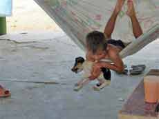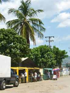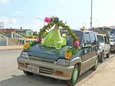 Nachdem wir 2 Tage am Schiff gewerkelt und geputzt haben, wollen wir zum Fischessen zu den bei Einheimischen und Seglern beliebten preiswerten Restaurants der Fischer (los Boqueticos) am Strand. Die 1 ½ km zu Fuß gehen oder ein Taxi nehmen, das ist jetzt die Frage? Dieser Stadtteil (El Paraiso) gilt als sehr gefährlichen und man hört immer wieder von bewaffneten Überfällen. Da wir mit sechs Personen losgehen, wagen wir es dann doch zu Fuß und sehen, wie ärmlich, aber fröhlich die Menschen in diesem Wohnviertel sind. An diesem Wochenende findet die „Fiesta“ zu Ehren der Virgen del Valle statt und viele Autos und Boote sind Blumen und Palmblättern geschmückt und in den Bars sind kleine Altare mit der Jungfrauenstatue aufgebaut. Vor jedem Haus sitzen die Familien zusammen, hören Musik und trinken Polarbier. Sonntag ist Familientag in Venezuela.