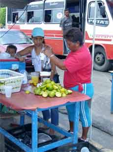 Am Dienstag, 5 Tage vor unserer Meridareise fahren wir zusammen mit Hansruedi, Vreni, Axel und Marja mit dem öffentlichen Bus in die Innenstadt von Puerto la Cruz, um die Fahrkarten für den Flamingo-Bus zu kaufen und die Sitzplätze zu reservieren. In den Straßen pulsiert das Leben, auch hier sind auf den Bürgersteigen Verkaufsstände aufgebaut, sodass fast kein Durchkommen ist. Es gibt Bekleidung in allen Variationen, Imbissständen mit Arepas, Empanadas und Hotdogs und wie überall in Venezuela, die berühmten Frischsaftverkäufer, die aus 7 bis 10 Apfelsinen einen „jugo de naranja“ pressen, der unsere Geschmacksnerven erblühen lässt. Im zentralen Busbahnhof (Terminale de Pasajero) müssen wir am Fahrkartenschalter unsere Reisepässe vorlegen und erhalten dann für 67.000 Bs pro Pers. (22,50 € für 1000 km Busfahrt!!) unsere Fahrkarten. Jetzt steht der Termin, am Sonntag 17.09. um 13.00 Uhr ist Abfahrt und wir können wir die warmen Pullover und Regensachen aus den Tiefen der Schaps rauskramen und durchlüften lassen. Doch heute versorgen wir uns im Mercado Municipal mit frischem Obst, Gemüse und Fleisch, das hier unvorstellbar günstig und von hervorragender Qualität ist.