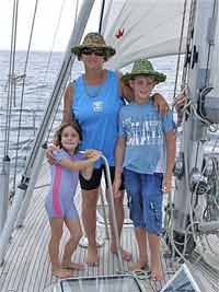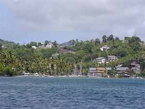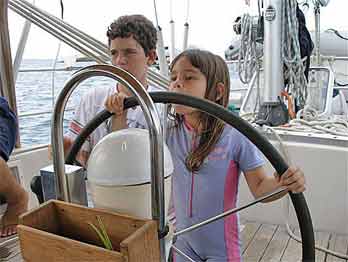 Nach 6 Stunden herrlichem Segeln mit "nur" einem heftigen Regenschauer klariert Helmut um 15.30 Uhr, kurz vor Büroschluss, in Rodney Bay/St. Lucia ein, das in der Nachsaison wie ausgestorben ist. An der "Happy Day Bar" (den ganzen Tag über das Bier zum halben Preis) sitzen nur Einheimische und wir als einzige Touristen und schauen Fußball. Ein elegant gekleideter einheimischer Geschäftsmann setzt sich zu uns. An der Krawatte mit dem Rotary-Wheel erkennen wir, dass es sich um ein Rotary Mitglied handelt. Wir kommen ins Gespräch und der Rotary-Freund Malcom lädt uns spontan ein, den Abend mit ihm zu verbringen. Wir fahren in seinem Auto zum Captain's Cellar am Pigeon Island, einer urigen traditionellen Bar. Dort wiederum lernen wir eine Familie aus Südafrika kennen, die erst seit 3 Monaten in St. Lucia lebt und arbeitet. Als sie hören, dass wir seit 1 Jahr auf einem Segelboot leben, sind sie sehr interessiert daran, mal einen Tag mit uns an Bord zu verbringen. Als Gegenleistung bieten sie uns für den nächsten Abend ein Barbecue in ihrem Haus an. Gesagt - getan; am Samstagmittag, pünktlich nach dem Fußballspiel Deutschland - Schweden segeln wir los. Alle sind begeistert, die beiden Söhne Zan und Niel und auch klein Erica fragen uns ein Loch in den Bauch. Der Höhepunkt ist dann, dass alle mal das Schiff steuern durften. Bade- und Schnorchelstopp vor Pigeon Island mit anschließendem Sundowner runden den Nachmittag ab. Beim Abendessen verabreden wir, dass wir uns im Dezember wieder treffen und uns St. Lucia zu Land und zu Wasser ansehen wollen. Auch mit Malcom wollen wir in Kontakt bleiben, er will uns, wenn wir wiederkommen seine Heimatinsel zeigen.