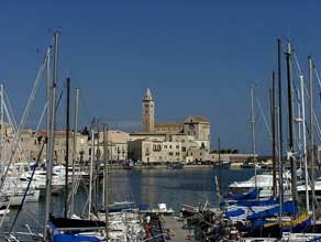 Wer kennt schon Apulien, das Herz des Mittelmeers, Brücke nach Osten und Kreuzweg im Strom der zahlreichen Kulturen des Mittelmeerraums. Wir können leider nur wenige Orte besuchen. Wie ein riesiges gestrandetes Schiff erhebt sich am Meer weiß und feierlich die im 11. Jahrhundert erbaute Kathedrale der Staufferstadt Trani. |