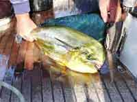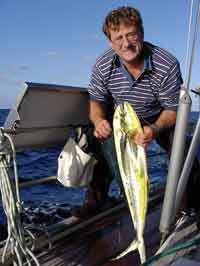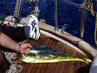 Zwischen den Riesentankern queren wir das Verkehrstrennungsgebiet mit Kurs auf Cap Espartel an der marokkanischen Küste. „Hier ist ja ein Verkehr wie in Frankfurt auf der Zeil!“ Bis 19.00 Uhr ist es jedoch noch hell und bald liegen diese nervigen Meilen hinter uns und wir brauchen nur noch schön Abstand halten zur „gefährlichen“ marokkanischen Küste. Mit 20-25 Knoten Wind aus Nordwest und langer Atlantikdünung können wir unter Vollzeug die ganze Nacht ruhig segeln. Unsere Angel wird auch wieder aktiviert und tatsächlich haben wir am nächsten Morgen einen wunderschönen blaugrün gold schimmernden Dolphin (Goldmakrele) mit großer Rückenflosse an der Angel. Mittags um 13 Uhr dann den 2. Dolphin mit 80 cm Länge. Oh, was tun wir bloß mit soviel Fisch, wir sind doch nur zu zweit an Bord. Aber ich bin ja eine kreative Köchin, 1. Mahlzeit Dolphin in Knoblauchbutter und Rosmarin mit Kartoffeln, 2. Mahlzeit Dolphin mit Dill-Sahnesoße und Reis und 3. Mahlzeit Dolphin mit Tomaten-Paprikasoße und Nudel. Eine Portion Fisch wandert mit Brühe gekocht ins Einweckglas, eine Portion wird angebraten und im Vakuumbeutel im Kühlschrank aufbewahrt. Unter den Rest gebratenen Dolphin mischen wir gehackte Zwiebeln und Kapern, Mayonnaise, Pfeffer, Salz und Zitrone und fertig ist der Brotaufstrich für das Frühstück.